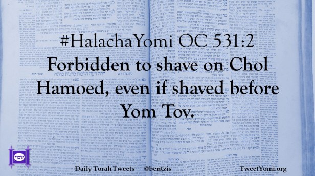 HalachaYomi #HalachaYomi OC 531:2 Date: November 23, 2023Author: netanelspitz #HalachaYomi OC 531:2 Forbidden to shave on Chol Hamoed, even if shaved before Yom Tov. Share this: Share on X (Opens in new window) X Share on Facebook (Opens in new window) Facebook Like Loading... Related
