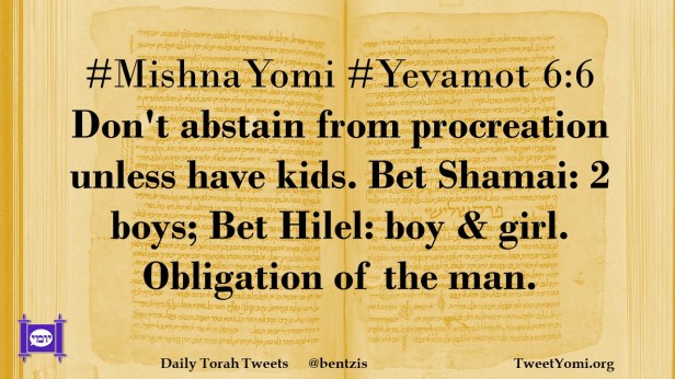 #MishnaYomi #Yevamot 6:6 Don’t abstain from procreation unless have kids. Bet Shamai: 2 boys; Bet Hilel: boy & girl. Obligation of the man.