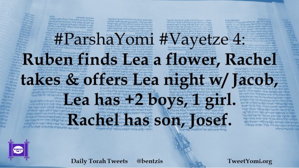 #ParshaYomi #Vayetze 4: Ruben finds Lea a flower, Rachel takes & offers Lea night w/ Jacob, Lea has +2 boys, 1 girl. Rachel has son, Josef.