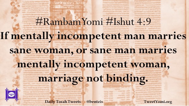 #RambamYomi #Ishut 4:9 If mentally incompetent man marries sane woman, or sane man marries mentally incompetent woman, marriage not binding.