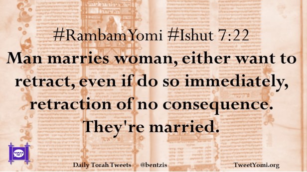 #RambamYomi #Ishut 7:22 Man marries woman, either want to retract, even if do so immediately, retraction of no consequence. They’re married.
