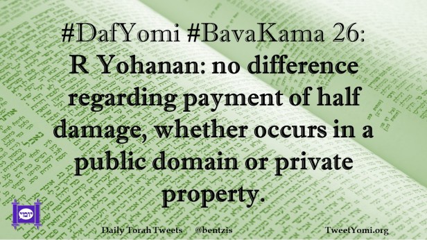 BavaKama, DafYomi #DafYomi #BavaKama 26 Date: November 29, 2023Author: netanelspitz #DafYomi #BavaKama 26: R Yohanan: no difference regarding payment of half damage, whether occurs in a public domain or private property. Share this: Share on X (Opens in new window) X Share on Facebook (Opens in new window) Facebook Like Loading... Related