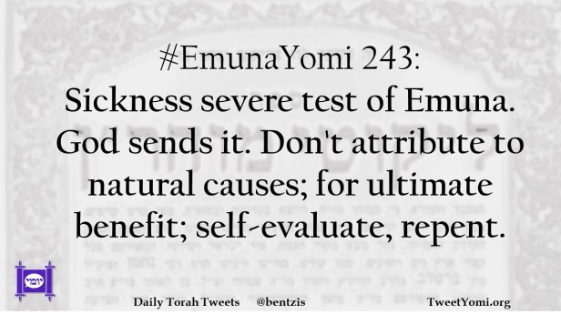 #EmunaYomi 243: Sickness severe test of Emuna. God sends it. Don’t attribute to natural causes; for ultimate benefit; self-evaluate, repent.
