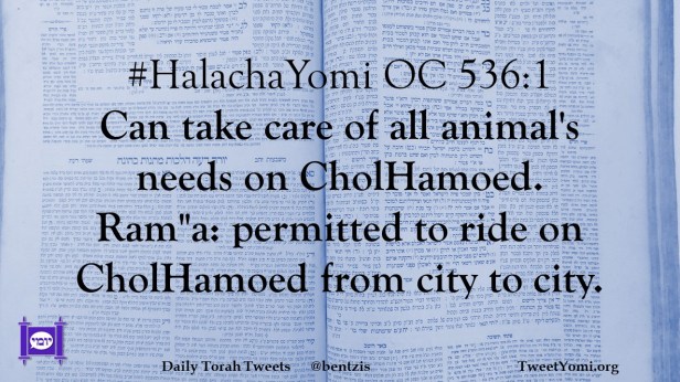 #HalachaYomi OC 536:1 Can take care of all animal’s needs on CholHamoed. Ram”a: permitted to ride on CholHamoed from city to city.