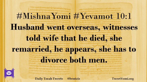 #MishnaYomi #Yevamot 10:1 Husband went overseas, witnesses told wife that he died, she remarried, he appears, she has to divorce both men.