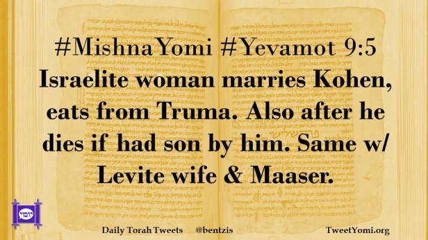 #MishnaYomi #Yevamot 9:5 Israelite woman marries Kohen, eats from Truma. Also after he dies if had son by him. Same w/ Levite wife & Maaser.