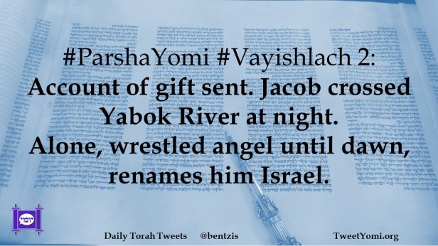#ParshaYomi #Vayishlach 2: Account of gift sent. Jacob crossed Yabok River at night. Alone, wrestled angel until dawn, renames him Israel.