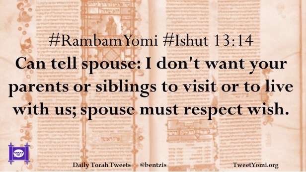 #RambamYomi #Ishut 13:14 Can tell spouse: I don’t want your parents or siblings to visit or to live with us; spouse must respect wish.