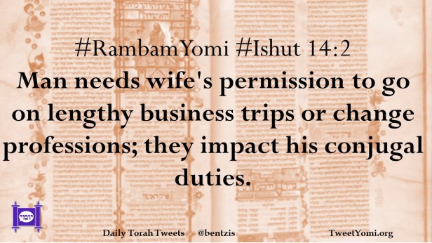 #RambamYomi #Ishut 14:2 Man needs wife’s permission to go on lengthy business trips or change professions; they impact his conjugal duties.