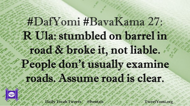 BavaKama, DafYomi #DafYomi #BavaKama 27 Date: December 3, 2023Author: netanelspitz #DafYomi #BavaKama 27: R Ula: stumbled on barrel in road & broke it, not liable. People don’t usually examine roads. Assume road is clear. Share this: Share on X (Opens in new window) X Share on Facebook (Opens in new window) Facebook Like Loading... Related