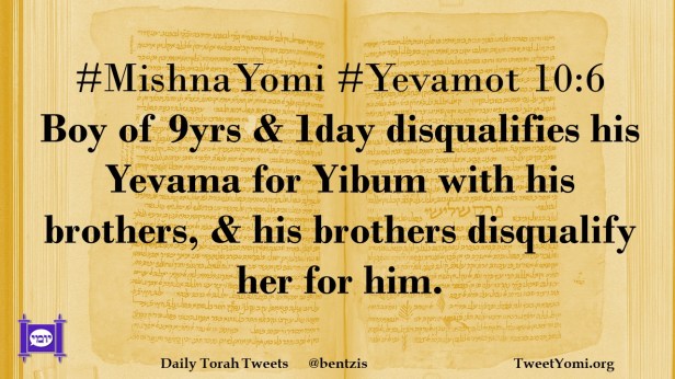 #MishnaYomi #Yevamot 10:6 Boy of 9yrs & 1day disqualifies his Yevama for Yibum with his brothers, & his brothers disqualify her for him.