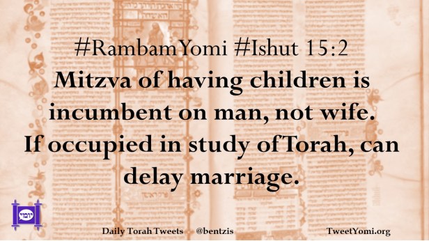 #RambamYomi #Ishut 15:2 Mitzva of having children is incumbent on man, not wife. If occupied in study of Torah, can delay marriage.