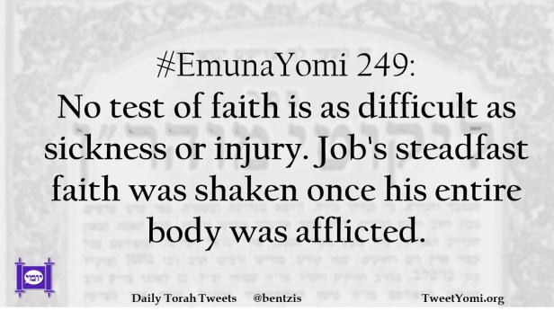 #EmunaYomi 249: No test of faith is as difficult as sickness or injury. Job’s steadfast faith was shaken once his entire body was afflicted.