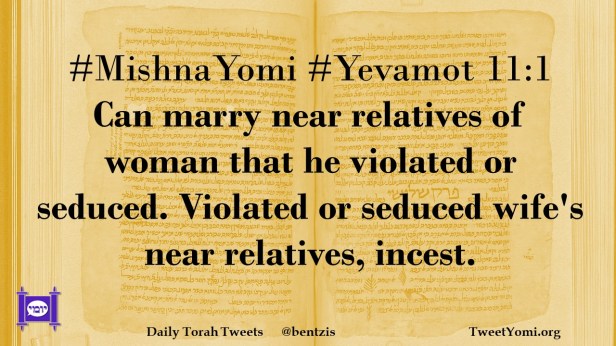 #MishnaYomi #Yevamot 11:1 Can marry near relatives of woman that he violated or seduced. Violated or seduced wife’s near relatives, incest.