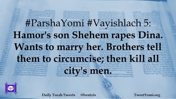 #ParshaYomi #Vayishlach 5: Hamor’s son Shehem rapes Dina. Wants to marry her. Brothers tell them to circumcise; then kill all city’s men.