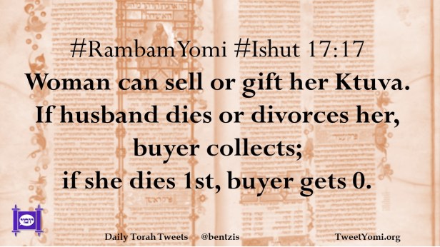 #RambamYomi #Ishut 17:17 Woman can sell or gift her Ktuva. If husband dies or divorces her, buyer collects; if she dies 1st, buyer gets 0.
