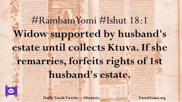 #RambamYomi #Ishut 18:1 Widow supported by husband’s estate until collects Ktuva. If she remarries, forfeits rights of 1st husband’s estate.