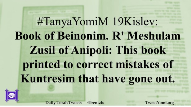 #TanyaYomiM 19Kislev: Book of Beinonim. R’ Meshulam Zusil of Anipoli: This book printed to correct mistakes of Kuntresim that have gone out.