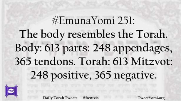 #EmunaYomi 251: The body resembles the Torah. Body: 613 parts: 248 appendages, 365 tendons. Torah: 613 Mitzvot: 248 positive, 365 negative.