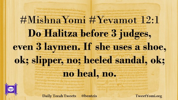 #MishnaYomi #Yevamot 12:1 Do Halitza before 3 judges, even 3 laymen. If she uses a shoe, ok; slipper, no; heeled sandal, ok; no heal, no.
