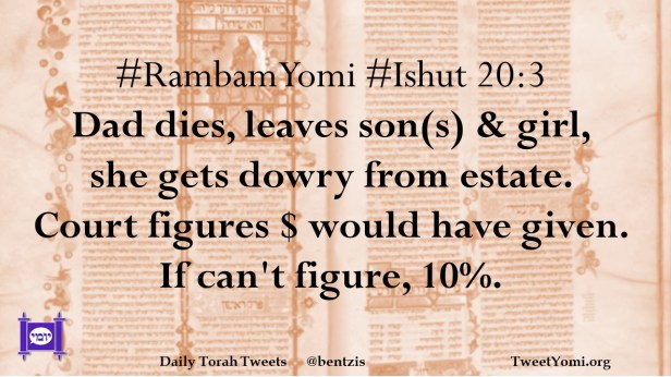 #RambamYomi #Ishut 20:3 Dad dies, leaves son(s) & girl, she gets dowry from estate. Court figures $ would have given. If can’t figure, 10%.