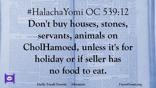 #HalachaYomi OC 539:12 Don’t buy houses, stones, servants, animals on CholHamoed, unless it’s for holiday or if seller has no food to eat.