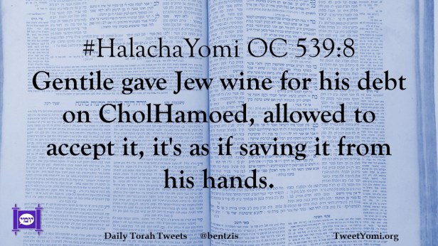 #HalachaYomi OC 539:8 Gentile gave Jew wine for his debt on CholHamoed, allowed to accept it, it’s as if saving it from his hands.