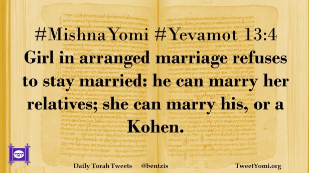 #MishnaYomi #Yevamot 13:4 Girl in arranged marriage refuses to stay married: he can marry her relatives; she can marry his, or a Kohen.