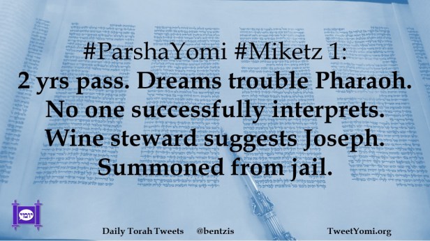 #ParshaYomi #Miketz 1: 2 yrs pass. Dreams trouble Pharaoh. No one successfully interprets. Wine steward suggests Joseph. Summoned from jail.