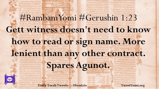 #RambamYomi #Gerushin 1:23 Gett witness doesn’t need to know how to read or sign name. More lenient than any other contract. Spares Agunot.