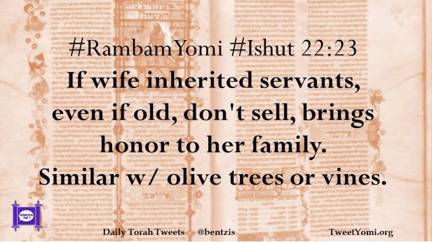 #RambamYomi #Ishut 22:23 If wife inherited servants, even if old, don’t sell, brings honor to her family. Similar w/ olive trees or vines.