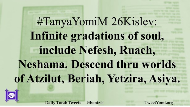 #TanyaYomiM 26Kislev: Infinite gradations of soul, include Nefesh, Ruach, Neshama. Descend thru worlds of Atzilut, Beriah, Yetzira, Asiya.