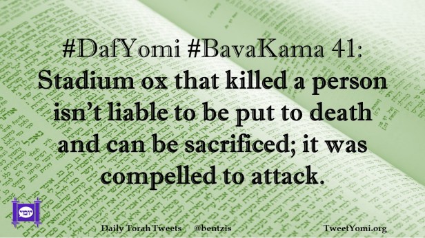BavaKama, DafYomi #DafYomi #BavaKama 41 Date: December 14, 2023Author: netanelspitz #DafYomi #BavaKama 41: Stadium ox that killed a person isn’t liable to be put to death and can be sacrificed; it was compelled to attack. Share this: Share on X (Opens in new window) X Share on Facebook (Opens in new window) Facebook Like Loading... Related