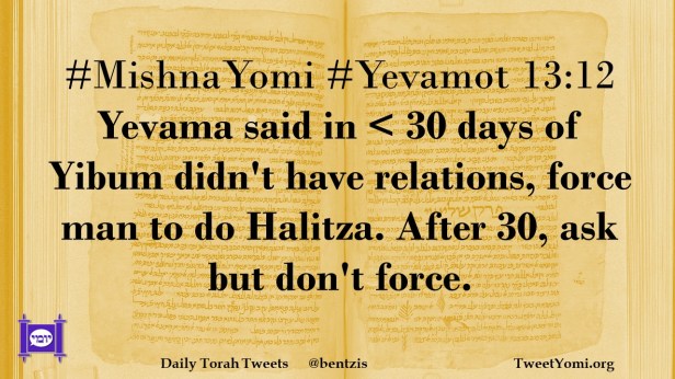 #MishnaYomi #Yevamot 13:12 Yevama said in < 30 days of Yibum didn’t have relations, force man to do Halitza. After 30, ask but don’t force.