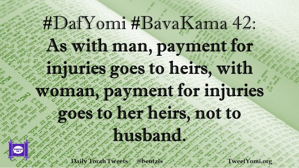 BavaKama, DafYomi #DafYomi #BavaKama 42 Date: December 24, 2023Author: netanelspitz #DafYomi #BavaKama 42: As with man, payment for injuries goes to heirs, with woman, payment for injuries goes to her heirs, not to husband. Share this: Share on X (Opens in new window) X Share on Facebook (Opens in new window) Facebook Like Loading... Related