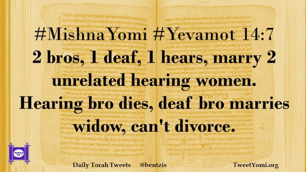 #MishnaYomi #Yevamot 14:7 2 bros, 1 deaf, 1 hears, marry 2 unrelated hearing women. Hearing bro dies, deaf bro marries widow, can’t divorce.