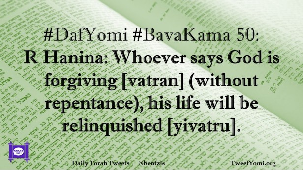 BavaKama, DafYomi #DafYomi #BavaKama 50 Date: December 28, 2023Author: netanelspitz #DafYomi #BavaKama 50: R Hanina: Whoever says God is forgiving [vatran] (without repentance), his life will be relinquished [yivatru]. Share this: Share on X (Opens in new window) X Share on Facebook (Opens in new window) Facebook Like Loading... Related