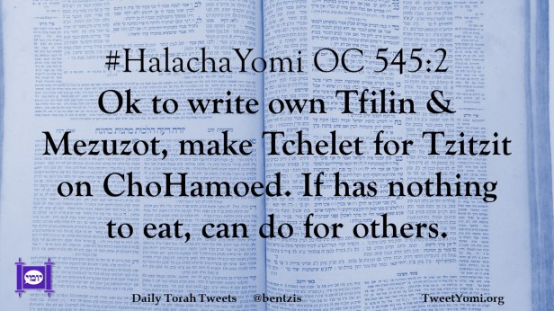 #HalachaYomi OC 545:2 Ok to write own Tfilin & Mezuzot, make Tchelet for Tzitzit on ChoHamoed. If has nothing to eat, can do for others.