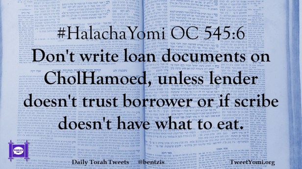 #HalachaYomi OC 545:6 Don’t write loan documents on CholHamoed, unless lender doesn’t trust borrower or if scribe doesn’t have what to eat.