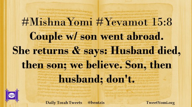 #MishnaYomi #Yevamot 15:8 Couple w/ son went abroad. She returns & says: Husband died, then son; we believe. Son, then husband; don’t.