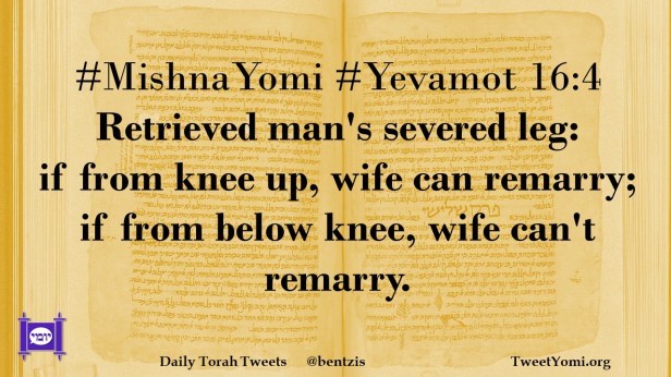 #MishnaYomi #Yevamot 16:4 Retrieved man’s severed leg: if from knee up, wife can remarry; if from below knee, wife can’t remarry.