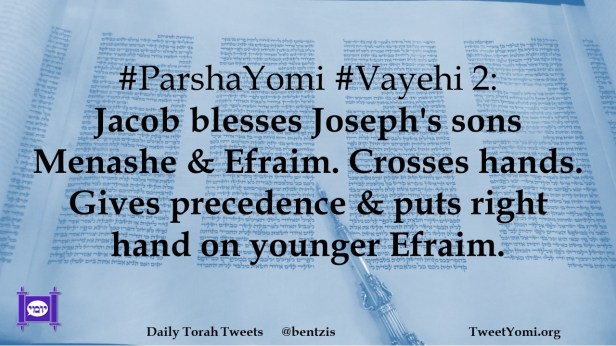 #ParshaYomi #Vayehi 2: Jacob blesses Joseph’s sons Menashe & Efraim. Crosses hands. Gives precedence & puts right hand on younger Efraim.