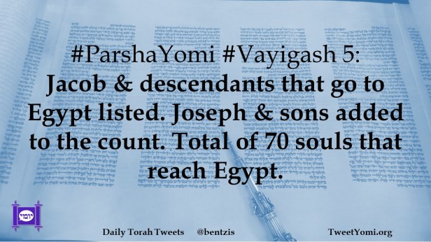 #ParshaYomi #Vayigash 5: Jacob & descendants that go to Egypt listed. Joseph & sons added to the count. Total of 70 souls that reach Egypt.