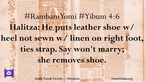 #RambamYomi #Yibum 4:6 Halitza: He puts leather shoe w/ heel not sewn w/ linen on right foot, ties strap. Say won’t marry; she removes shoe.
