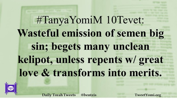 #TanyaYomiM 10Tevet: Wasteful emission of semen big sin; begets many unclean kelipot, unless repents w/ great love & transforms into merits.