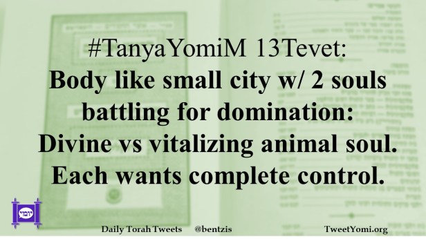 #TanyaYomiM 13Tevet: Body like small city w/ 2 souls battling for domination: Divine vs vitalizing animal soul. Each wants complete control.
