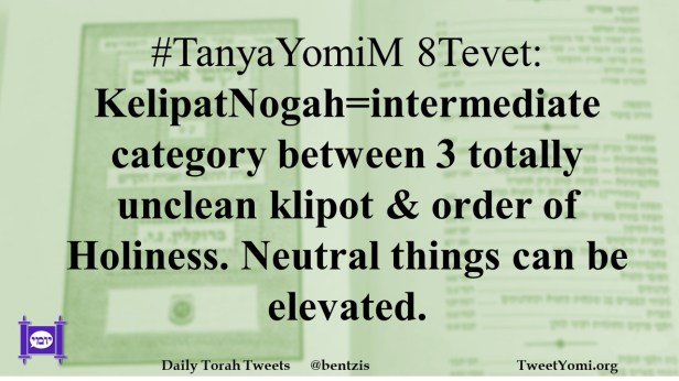 #TanyaYomiM 8Tevet: KelipatNogah=intermediate category between 3 totally unclean klipot & order of Holiness. Neutral things can be elevated.