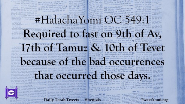 #HalachaYomi OC 549:1 Required to fast on 9th of Av, 17th of Tamuz & 10th of Tevet because of the bad occurrences that occurred those days.