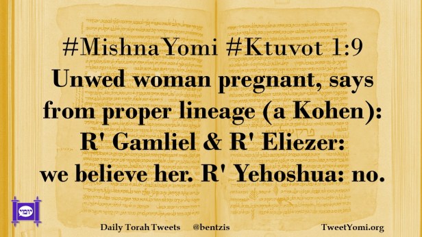 #MishnaYomi #Ktuvot 1:9 Unwed woman pregnant, says from proper lineage (a Kohen): R’ Gamliel & R’ Eliezer: we believe her. R’ Yehoshua: no.
