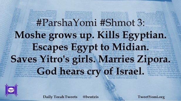 #ParshaYomi #Shmot 3: Moshe grows up. Kills Egyptian. Escapes Egypt to Midian. Saves Yitro’s girls. Marries Zipora. God hears cry of Israel.